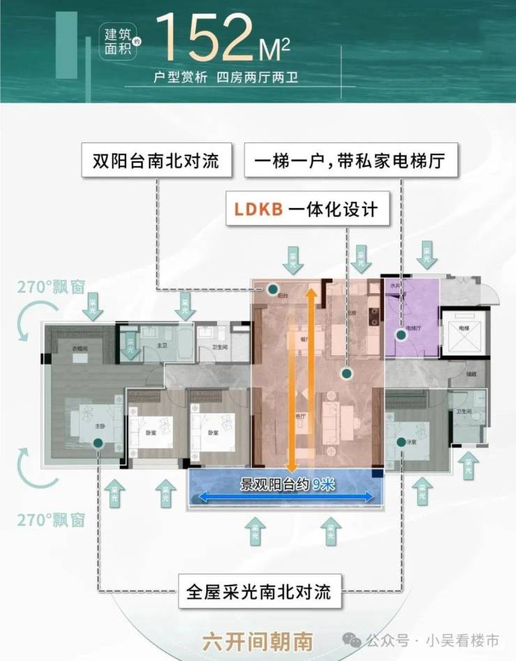 建面152平纯板楼,双套房设计,专梯入户,约3.3米豪阔层高,6开间全南向,客厅开间约6米,搭配约9米长大阳台,空间尺度超豪华,四个卧室都能放1.8的大床,总价770-880万左右。