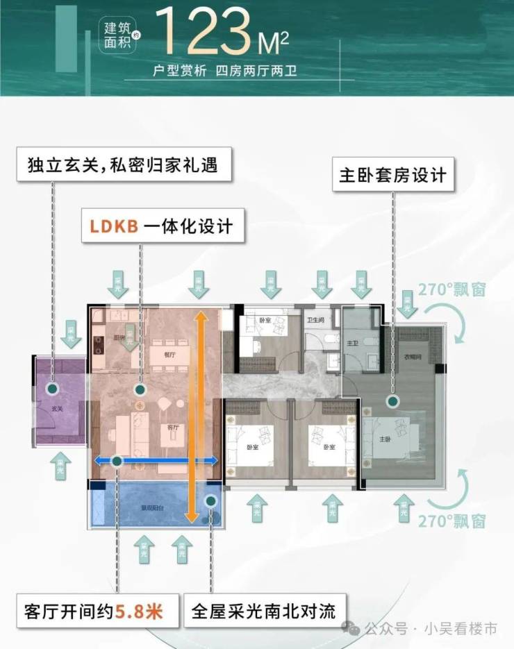 建面约123平,到了这个面积段,就是改善级别了,同样是南北对流户型,超大南向面宽,采光通透、观景尺度更广,并且,这个户型的可改造空间更大,比如和主卧同一侧的次卧,可以拆分为两个次卧,也可以打造成一个大房间,总价552-620万左右。