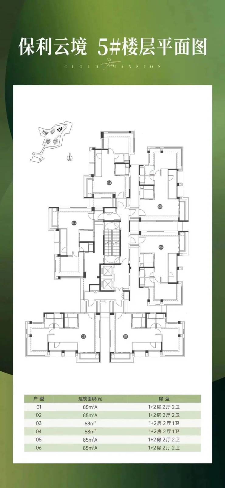 保利云境整体规划了 5 栋 30 - 32 层的住宅,采用围合式布局。在售产品涵盖 68㎡、85㎡和 110㎡的三至四房户型,这些户型实用率超 110%,在空间利用上更具优势。