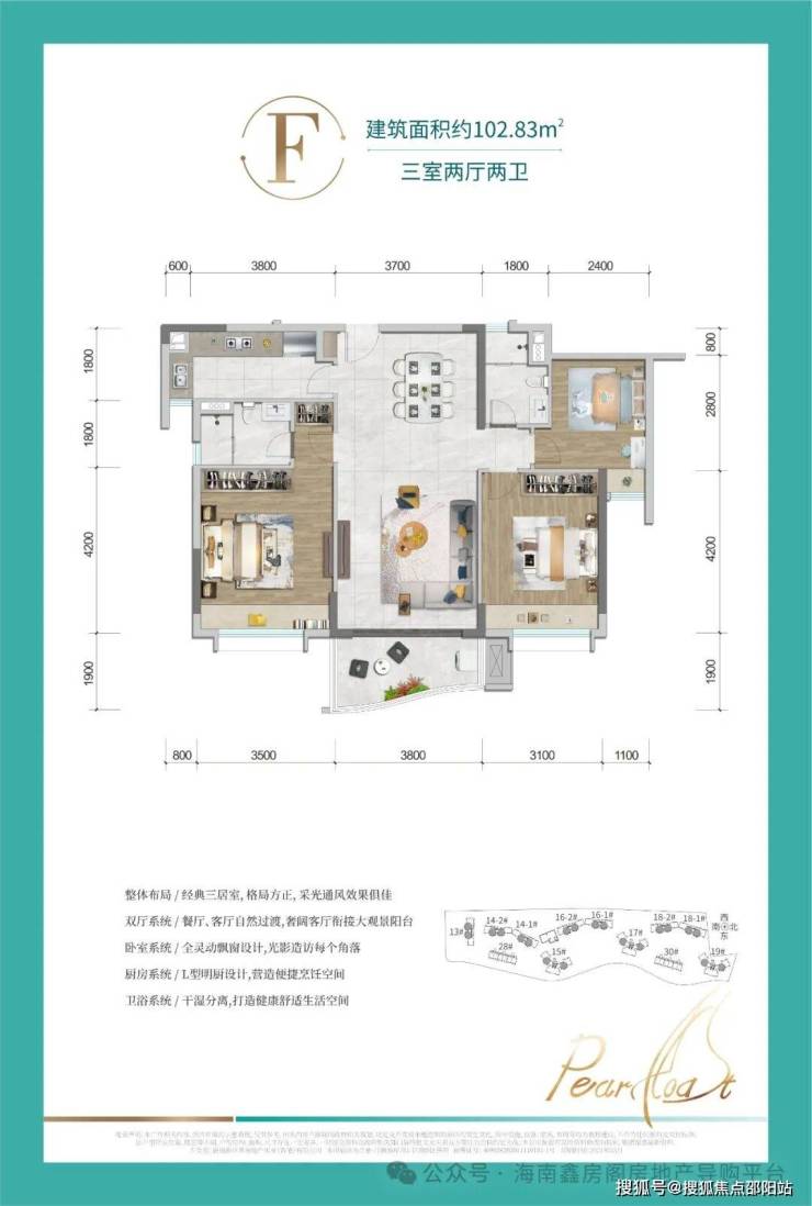 F户型-建筑面积约102㎡ 三室两厅两卫:餐客厅一体化,L型明厨设计