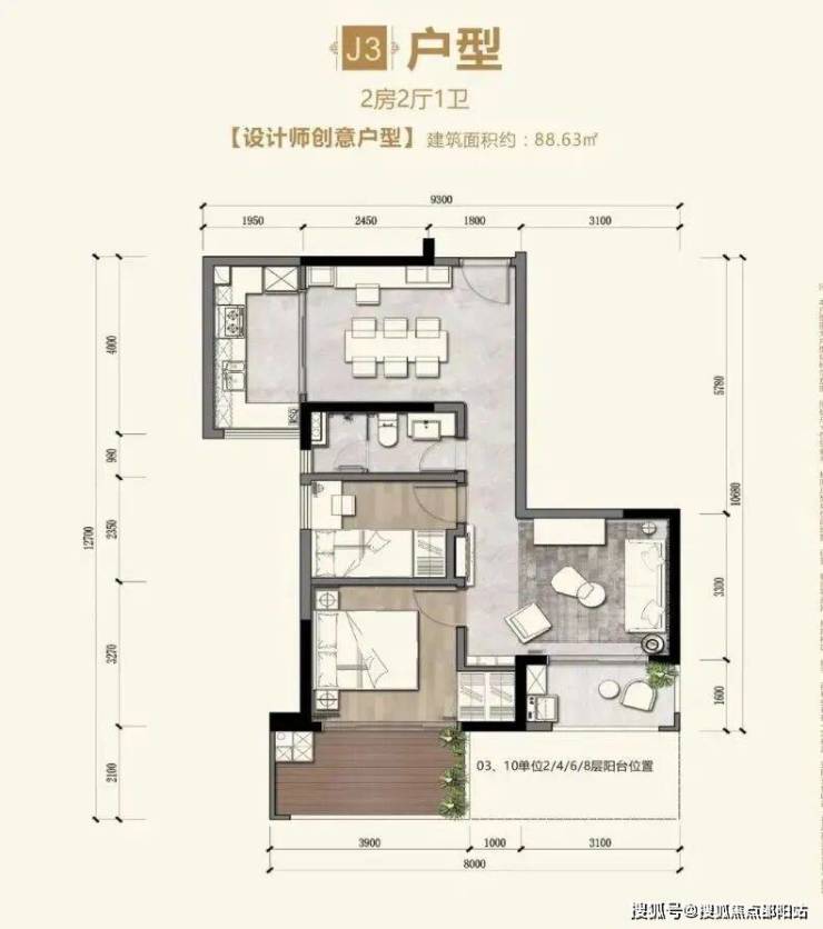 J3户型【88.63㎡】2房2厅1卫