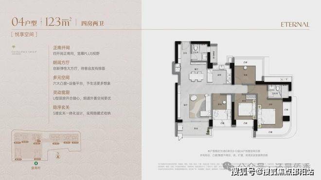 105㎡神户型:实现四开间朝南+3+1房灵动布局,客厅与阳台相连,采光通风俱佳,满足三代同堂或二孩家庭的改善需求。