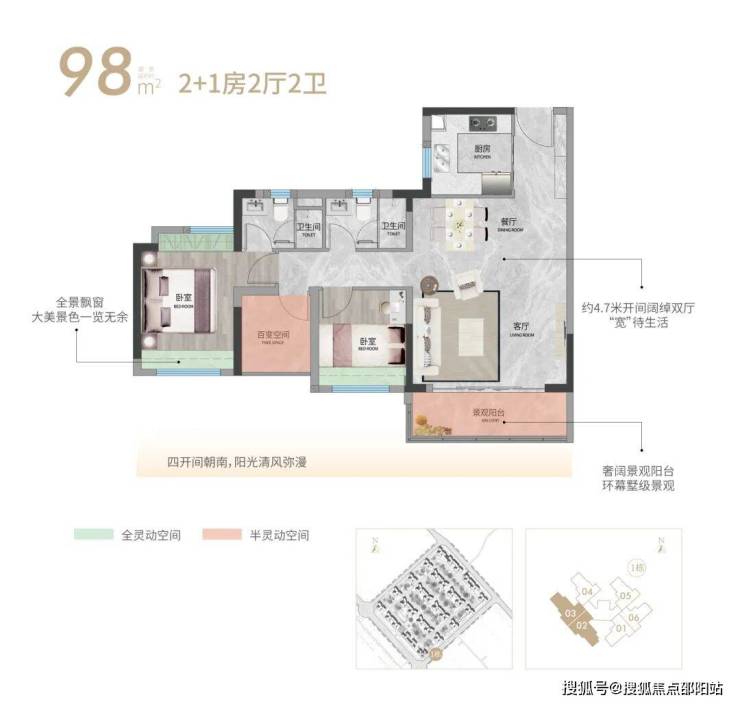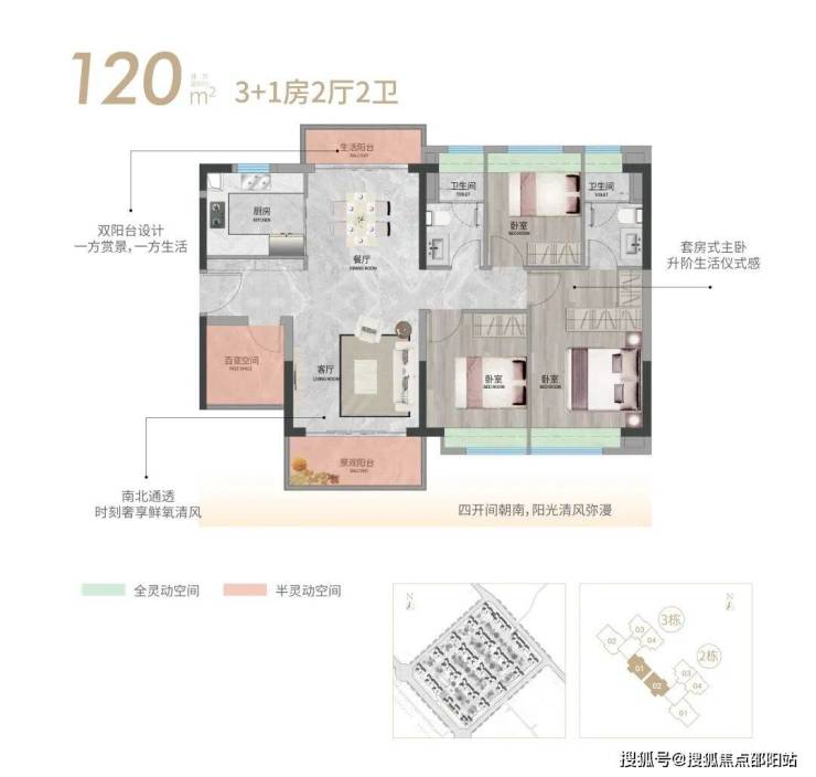 双阳台+阔绰双厅南北通透,四开间朝南,套房式主卧更多生活仪式感