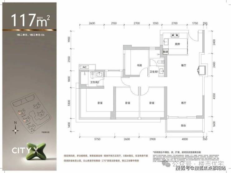 建面约117㎡4房,只有52套,为了追求高舒适度生活的买房人而准备,是108㎡4房的PLUS版本。