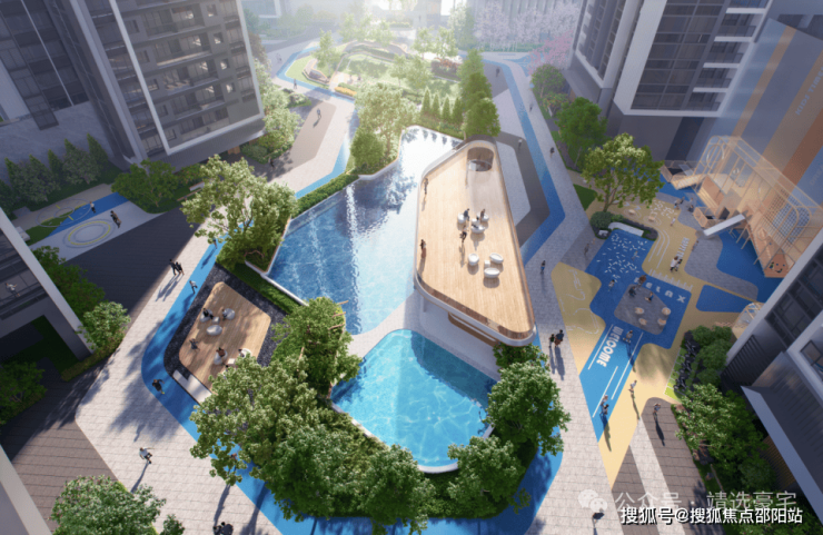 多元交互园林:空中运动花园、全龄亲子双游泳池、环氧跑道、稚趣IP乐园、城市会客厅等,亲子、社交、远动一应俱全;