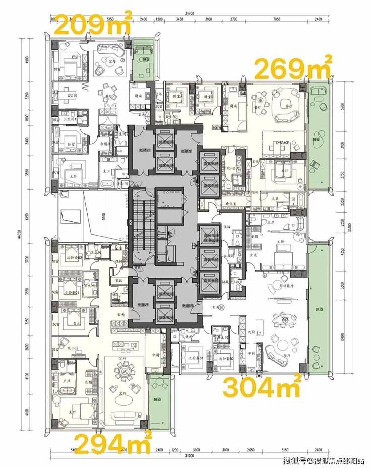 项目首推北区1-2栋共348套房源,户型覆盖209-1100㎡,全部四房三卫起步,彻底告别刚需化设计,保证了圈层的纯粹性。其中,高区58层以上为500-700㎡的顶级大平层,顶楼1100㎡的顶奢大平层仅2套,总价从3000万起,顶楼更是高达4-5亿,单价区间在14-46万/㎡,精准锁定金字塔尖客群。
