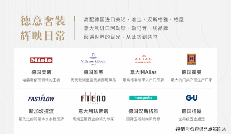 5、品质价值,全球顶级一线品牌精工品质,匠心打造人性化细节:德国Miele、hansgrohe、唯宝;意大利阿勒斯、珐帝诺、LEMA;比利时瑞纳斯;日本大金、百乐满;新加坡捷流等;