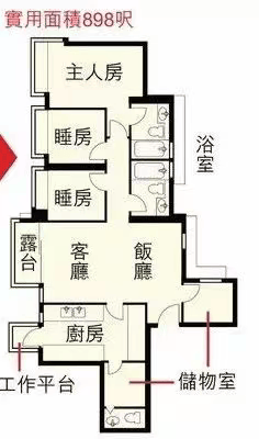 清水示范单位为5座36楼E室,实用面积898平方呎,3房连套房及储物室加储物室连厕间隔,此类双储物室间隔为2期特有。