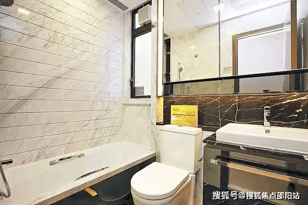 主人套厕设有浴缸,地面及墙身铺设石材,白色石纹墙身与地板的黑色石纹互相对比,尽显典雅气派。