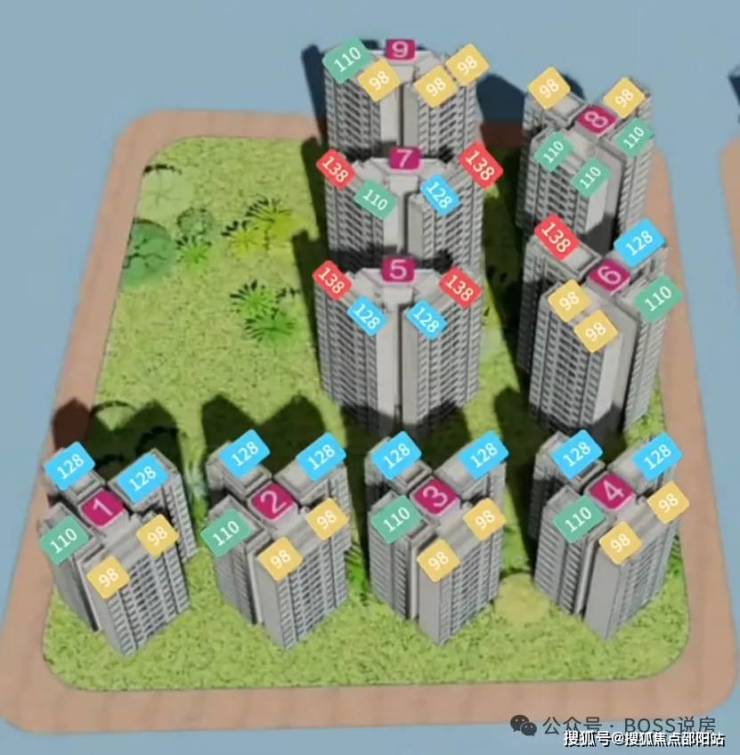 三期产品主要由9栋11~15层高的小高层组成,和二期形成联动,两期中间做了一个小公园,采用了蝴蝶形设计,做到户户朝南,没有正对直视。