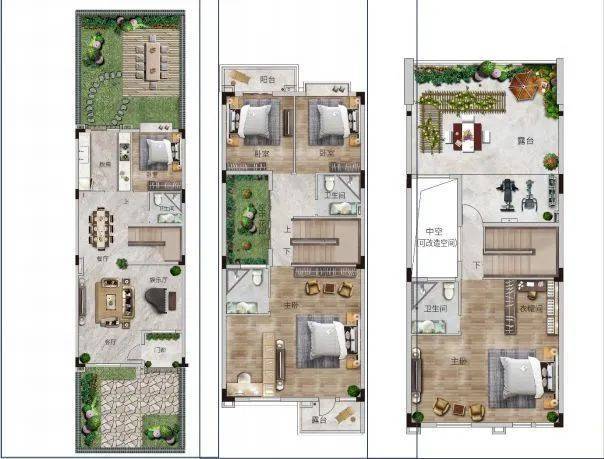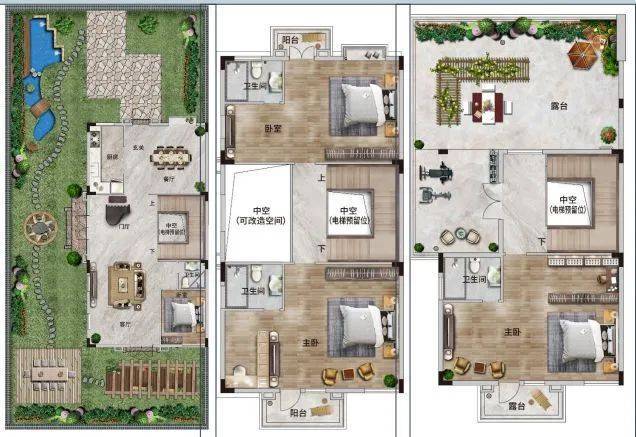 四联二层半,建筑基底卙地约100㎡,6.6米开间客厅面积:65㎡,双主套设计带约67-125㎡超大花园露台+中空赠送面积约50㎡284㎡联排别墅
