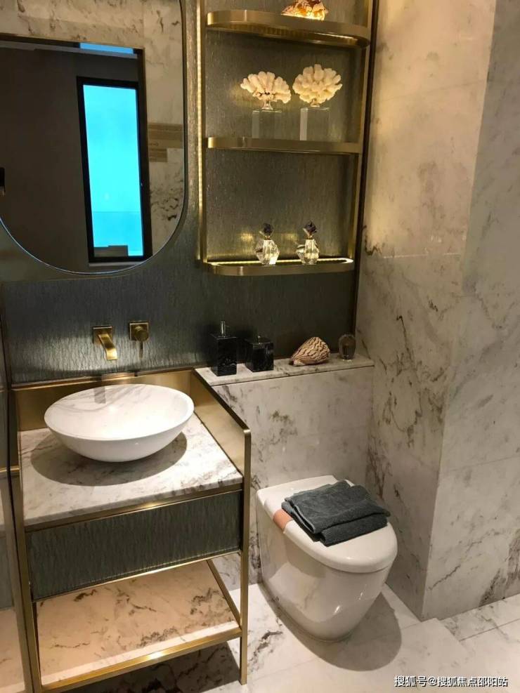 设计师将客厕门拆除,改为套厕设计,套厕备有淋浴间,并以石材铺砌。铜色面板配合玻璃墙面,整体简洁奢华。