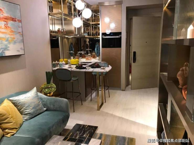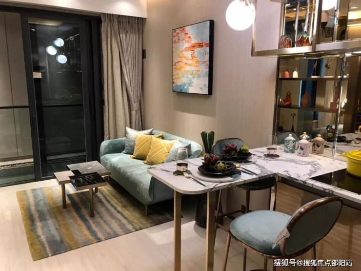 客厅方面,则放有湖水蓝色及黄色的梳化及地毯,营造温暖感觉,并以挂画作点缀。