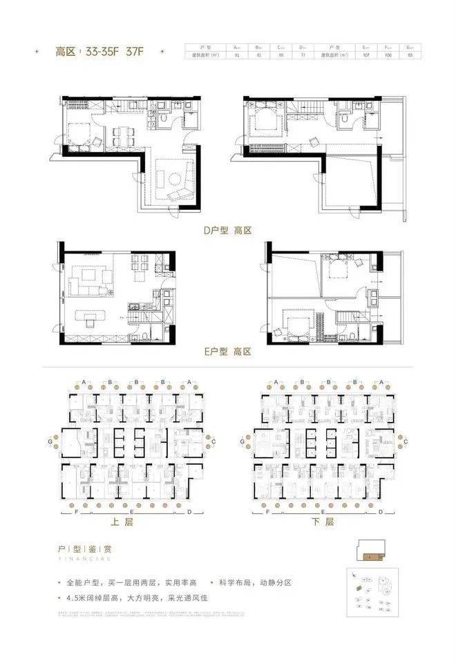5栋小户型公寓,总高37层6梯23户,南向(50、75㎡);北向(40㎡;22~26层41、81㎡复式);
