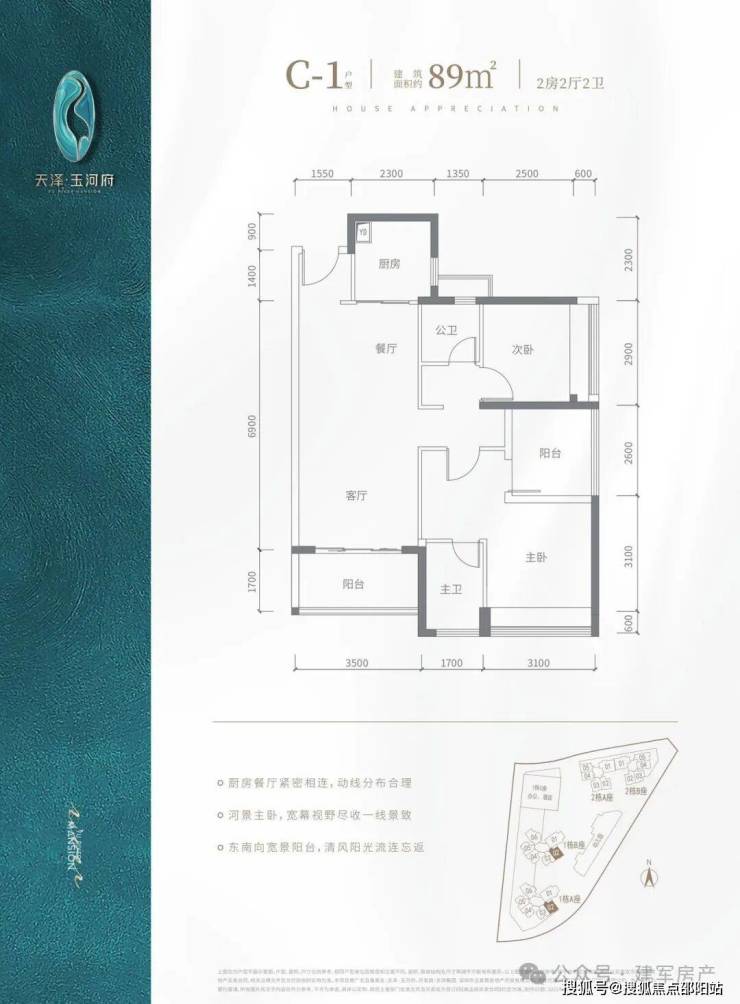 横厅南北通透格局,约6.5米大阳台连接客厅跟次卧,客餐厅开间约7.3米,双套房设计,南面套房开间约3.5米,带一个独立阳台,北面套房开间约3.6米,两个次卧开间约3.1米,约2.6米;阳台东南朝向,看茅洲河景观。