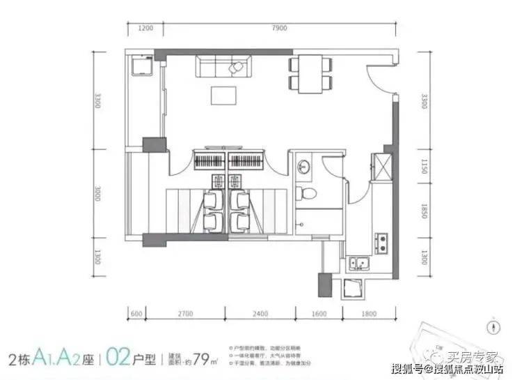 户型设计:2栋A座的79㎡的两房一卫,户型比较方正,厅出阳台。