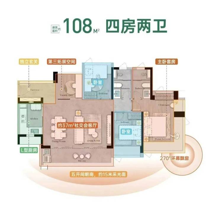而且,它的主卧还配置了270°环幕飘窗,带来了最大化的采光面及观景视野。