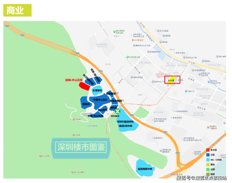 小区周边商业会有欠缺,商业集中一些的可以开车2公里去到盐田路地铁站那边,这里商业比较集中,还有人人乐,再大一些的商业可以去到壹海城,距离5公里,地铁2个站可以到。