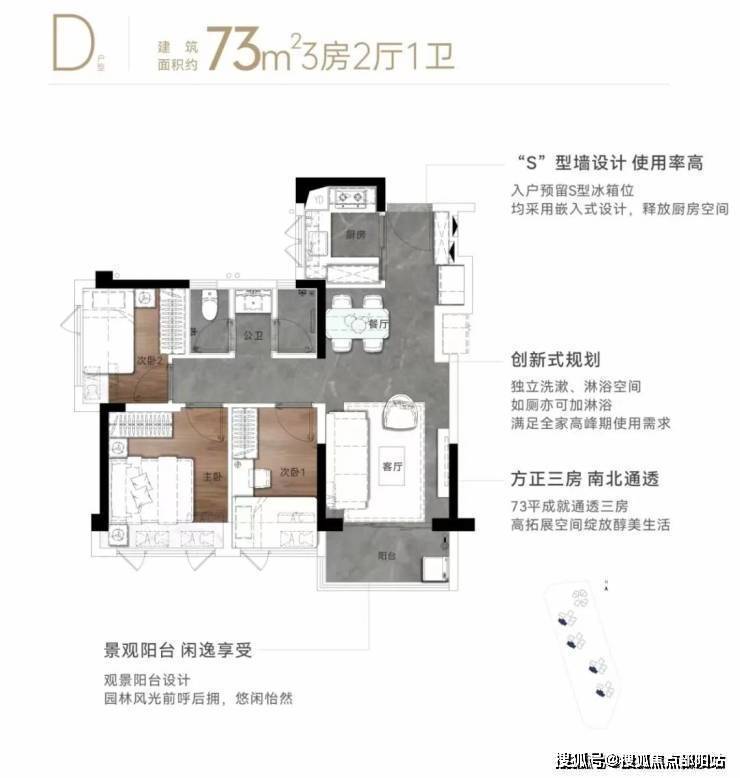 73㎡的3房2厅1.5卫,设计的是竖厅格局,客厅3.1米开间,入户预留S型冰箱位,三开间朝南,U型厨房,创新式卫生间设计,独立洗漱,沐浴空间,如厕也可加沐浴,得房率80.3%(不加飘窗),都是西南朝向。