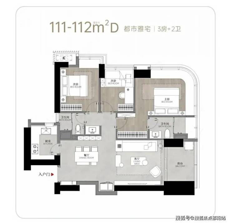 111-112平方米三房两卫为东南朝向,设计为纯正三房,竖厅布局,面宽约9.2米,进深约7.9米,配备约3.8米景观阳台加生活阳台。该户型得房率约72%,含赠送后可达80%。