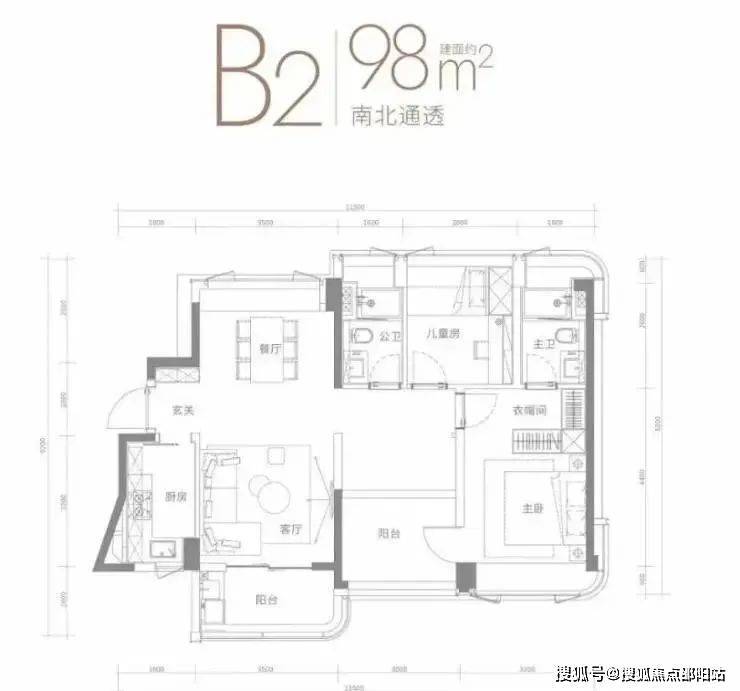 约98㎡户型,南北通透,南向采光面达到11.5米,除了承重墙部分外,都做成了阳台和飘窗,连两个卫生间都有一整面的飘窗,做到室内全明。主卧也是南北向布局,起居舒适度很好。
