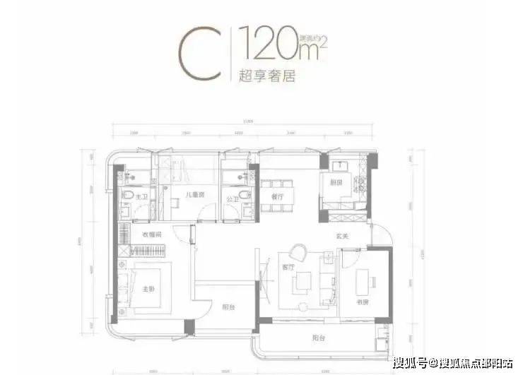 约120㎡户型,玄关处多一间房,跟客厅共享6.2米阔景阳台。这个空间可以做成书房或者娱乐室,工作休闲都有一处安静的空间。还能跟客厅打通,还形成一个开间6.2米的超大横厅。主卧套房尺度达到约3.4米*4.6米,带步入式衣帽间和独立卫生间。