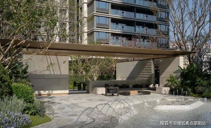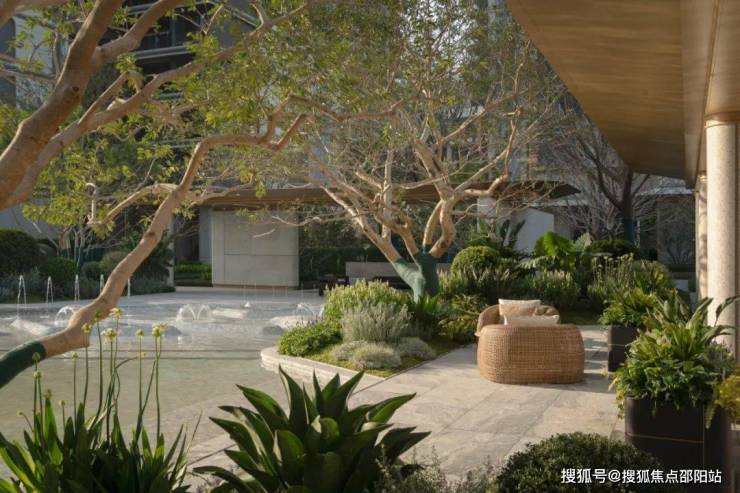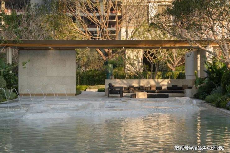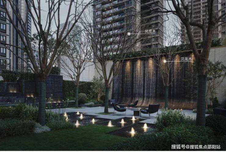 高约5.8米的立面叠水水幕与地面涌泉连成一片,凤凰木掩映其间,打造出犹如度假般的惬意氛围。