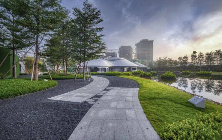 合院采用岭南设计风格,270°风光围合,用石材铺装,以草坪加灌木、乔木的方式创造出了多重立体植物的庭院空间,以石柱、月洞门等景观小品加以点缀。