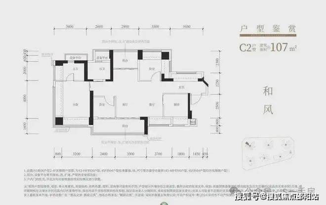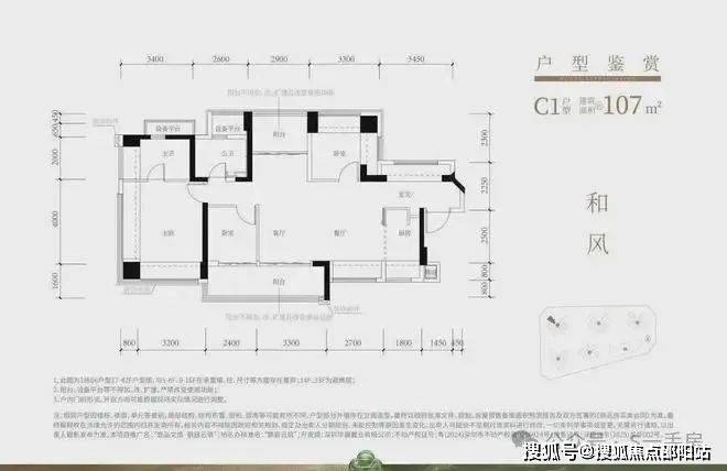107㎡的4房2厅2卫,设计的是横厅南北通透格局,进门赠送约4㎡入户玄关,客餐厅5.9米开间,4个卧室分别做到了主卧17.9㎡/次卧9.48㎡/次卧8.47㎡/次卧6.06㎡(实测面积,去掉墙体),主卧+1个次卧270°飘窗,客厅连接次卧出5.7米长大阳台,U型厨房,得房率约102.5%(包含赠送),阳台主朝西南向。