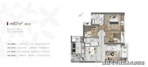 带主套设计,保障主人生活私密性 。89 平户型四开间朝南,阳光充足 。三个房间带有大飘窗,增加空间使用灵活性与采光面 。整体户型布局合理,满足一家三口或四口的居住需求 。
