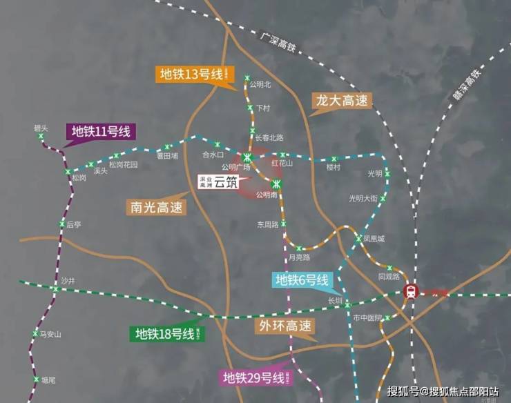 深业云筑,位于深圳市光明区公明街道马田街道石家社区,地处光明科学城大科学装置区,是粤港澳大湾区核心区域及广深科技创新走廊重要节点,承接南山区科技外溢,毗邻东莞松山湖,区位优势显著。项目紧邻地铁6号线公明广场站(1.1公里)及在建13号线公明南站(约700米),未来可直达南山科技园、后海总部基地;周边龙大、南光高速无缝衔接福田、南山,交通便捷