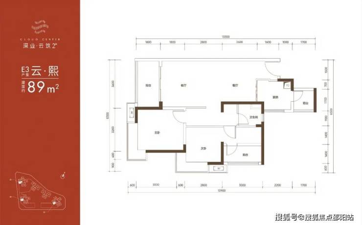 89㎡的3房2厅1卫,E2户型,设计的是竖厅格局,客厅3.6米开间,LDKB一体化设计,3个卧室分别做到了主卧13.5㎡/次卧9.54㎡/次卧8.1㎡(含墙体飘窗),L型厨房还带1个小生活阳台,卫生间三段式分离,得房率:79.89%(不含赠送),东南/西南或正南朝向。