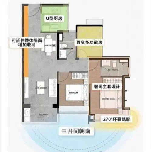 整体价值:7.6m³整墙收纳+南向9m采光面+5㎡全景厨房+270°景观主卧套间