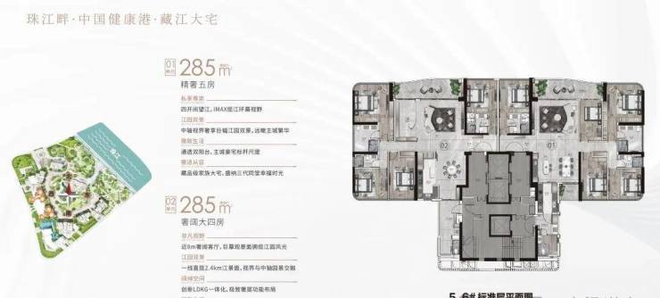 ● 户型:建面约233-285㎡四至五房,东向/东南向一线望江,极致3.4-3.6m层高