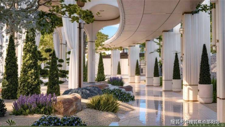 约75米风雨连廊,让业主回家不必淋雨或暴晒,两侧搭配错落有致的南法树种。每一棵树、每一个摆放位置,都经过反复推敲——不惜成本与心血。廊下是无边界社交场,廊外是南法花园。