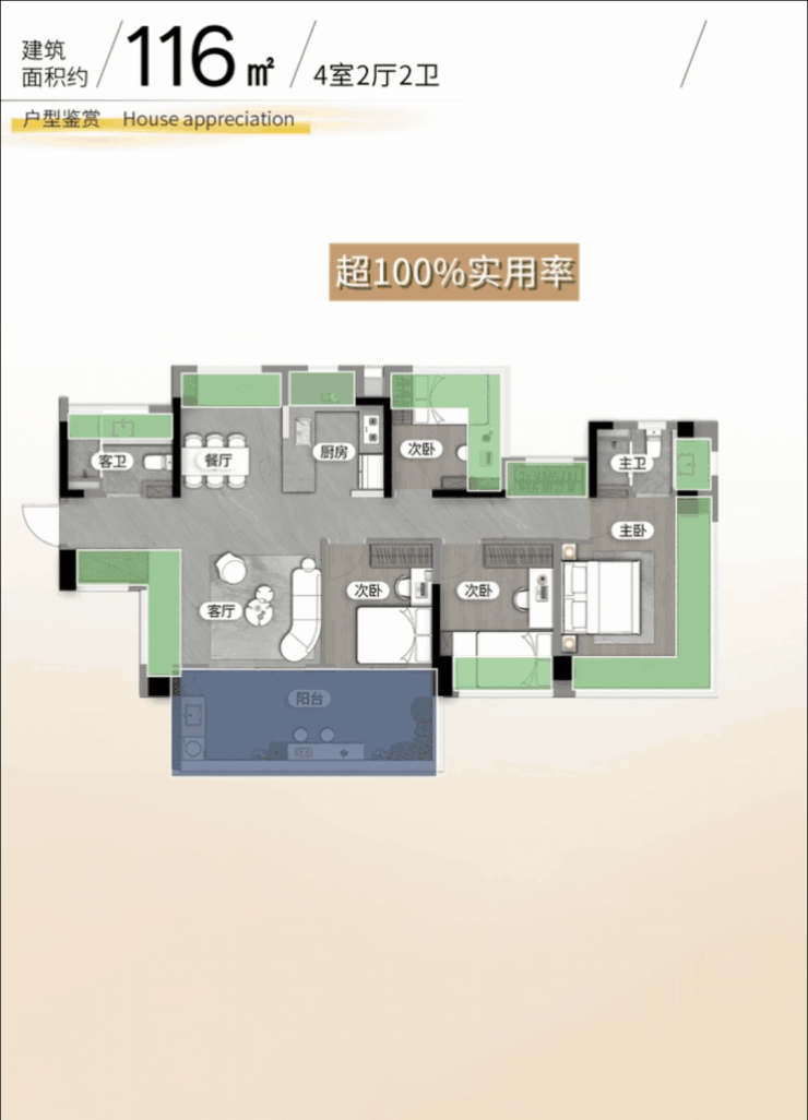 约116㎡实现超100%实用率,四开间朝南,约16米面宽远超进深,阳光清风自在流淌。客厅最大可做约7.25米横厅,X空间随需定制。南向约6.45米巨幕阳台贯通客厅与次卧,主卧约20㎡酒店式套卧,270°巨幕视野揽尽城央盛景。