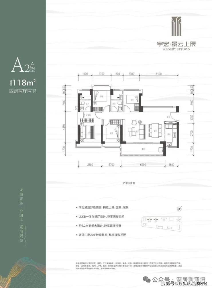 118㎡的4房2厅2卫,设计的是横厅南北通透格局,客餐厅6.2米开间,五开间朝南,西北面5.4米长的观景大飘窗,4个卧室分别做到了主卧16.66㎡/次卧9.72㎡/次卧9.18㎡/次卧6.9㎡(包含墙体飘窗),客厅连接餐厅位出6.2米长的大阳台,得房率约76%(不含赠送),东南朝向。宇宏景云上辰售楼中心24小时电话🎄:4008370533【开发商已认证】