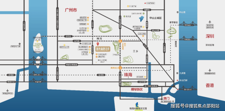 项目位于神湾大道中,距离广珠西线高速口仅5分钟车程,可快速通达中山城区(30分钟)、珠海南湾(30分钟)、珠海横琴(35分钟)、珠海拱北(40分钟)及澳门(50分钟),经广珠西线高速转港珠澳大桥可快速达香港(60分钟);