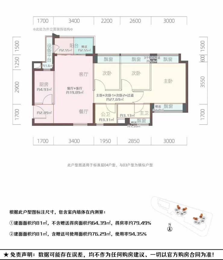 81㎡的3房2厅2卫,设计的是竖厅南北通透格局,客厅3.4米开间,3个卧室分别是3米/2.6米/2.2米的宽度,L型厨房,得房率:94.35%(包含赠送),阳台西北或东北朝向。