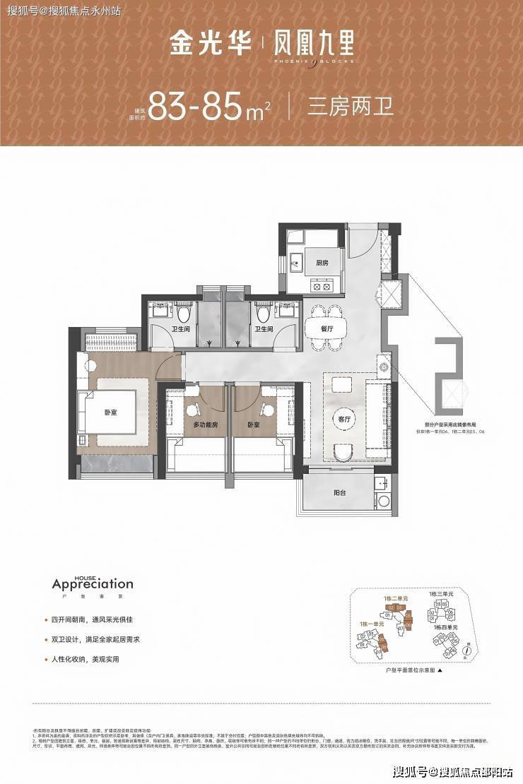 金光华凤凰九里,于2023年11月23日取证入市,推售面积68㎡的2房1卫,83-85㎡的3房2卫,106㎡的4房2卫户型,备案均价4.21万/㎡,备案单价3.72-4.9万/㎡,总价263-522万/套, 折后单价3.1万/㎡,总价210万起,计划2026年3月带精装交付,