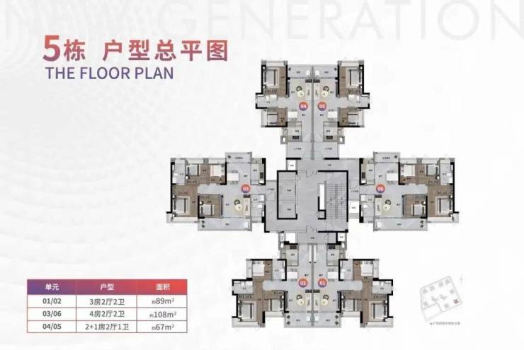 项目首推2、4、5栋,其中2栋是两梯三户,4和5栋是两梯六户,户型为建面约67-119平的二至四房。