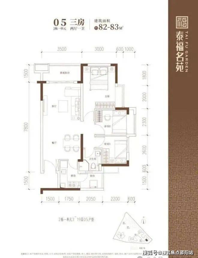 建面约82-83㎡的3房2厅1卫户型,在保证空间尺度感的前提下做到3个房间,实用性高