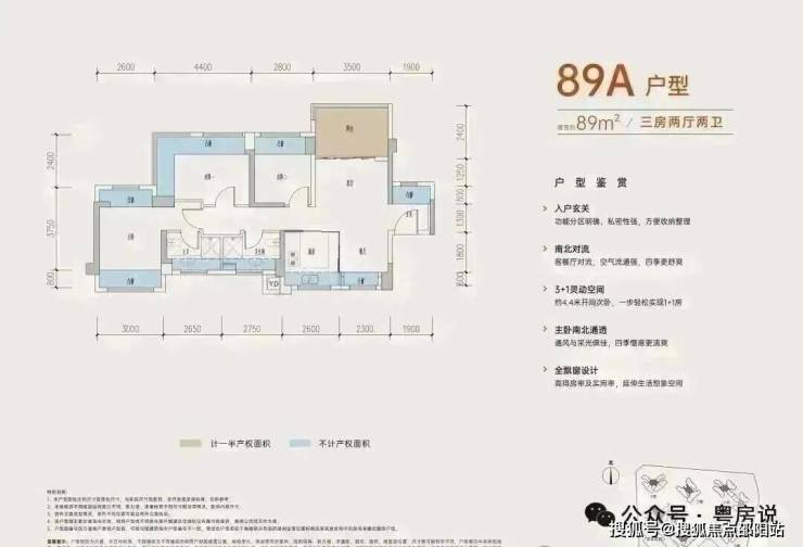 89㎡的3+1房2厅2卫,A户型,设计的是竖厅南北通透格局,进门入户玄关,客厅3.5米开间,,五开间朝南,主卧南北通透双飘窗,3个卧室分别做到了主卧15.73㎡/次卧14.08㎡/次卧8.96㎡(包含墙体飘窗),得房率约:77.39%(不含赠送),阳台主朝东北向,这次推出最靓的户型可以改4房,赠送面积24.5㎡,加上赠送得房率高达104.87%。