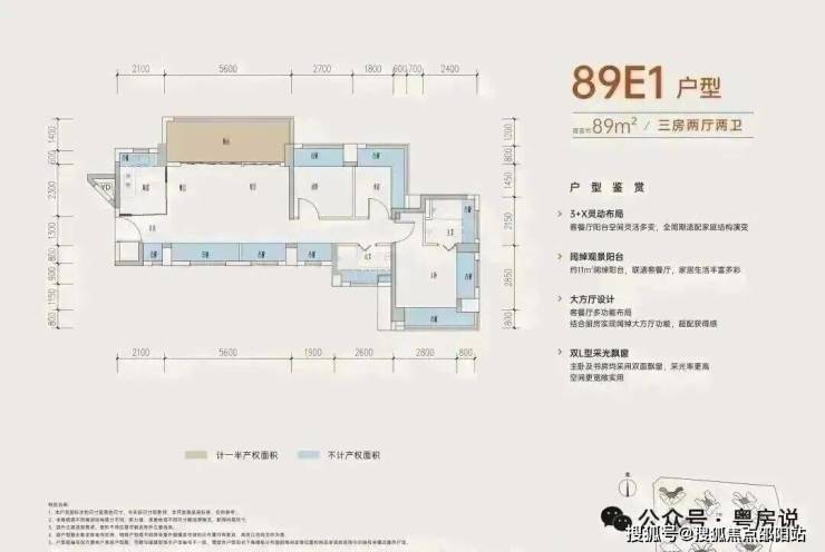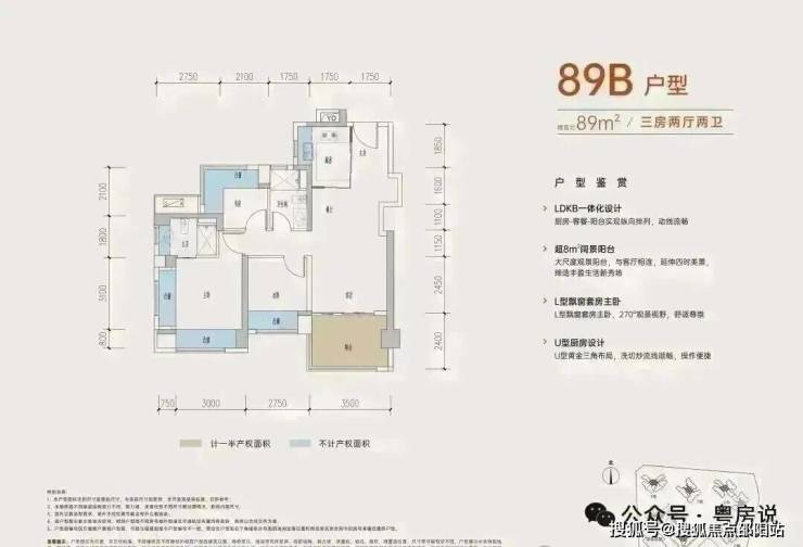 89㎡的3房2厅2卫,B户型,设计的是经典竖厅格局,进门入户玄关,客厅3.5米开间,三开间朝南,,主卧+1个次卧270°飘窗,3个卧室分别做到了主卧15.1㎡/次卧8.52㎡/次卧7.77㎡(包含墙体飘窗),得房率约:77.39%(不含赠送),西南朝向。赠送面积16.96㎡,加上赠送得房率96.84%。
