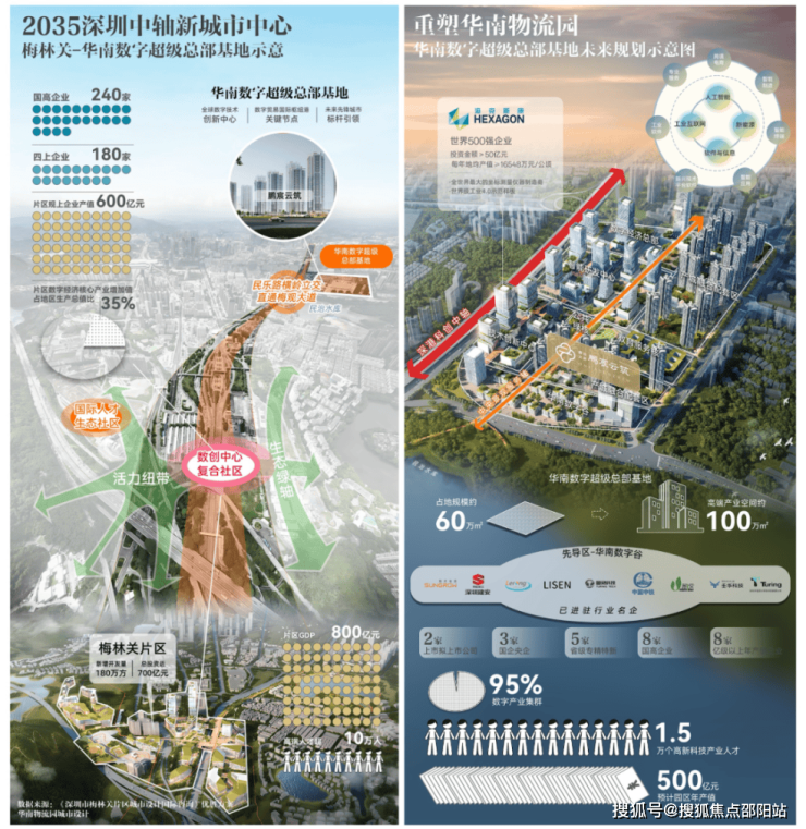 板块内的华南数字超总,对标的是腾讯企鹅岛、深圳湾超级总部基地、香蜜湖金融中心,预计打造成为深圳第四大微城市。60万㎡的产学研商住一体化优质土地空间,已汇集35+龙头名企,世界500强海克斯康亦强势落户。可以预见,华南数字超总95%的数字产业集群浓度,将支撑起未来500亿元年产值,赋能区域价值持续跃升。