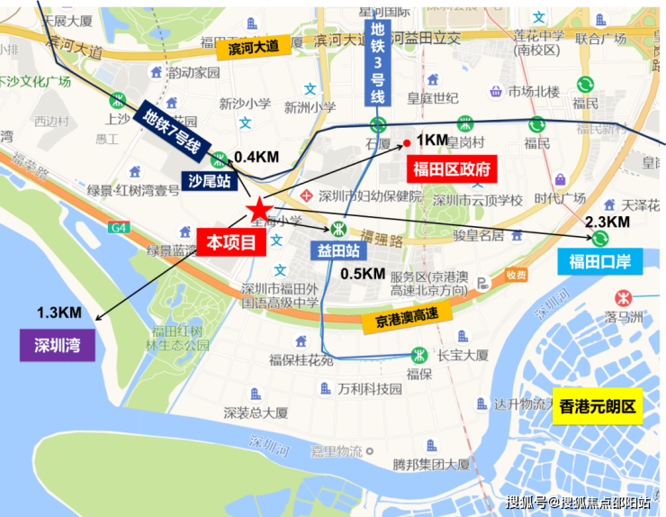 项目地处福田区核心区域大金沙片区,毗邻红树林生态公园,距离区政府仅直线1公里。这里北部衔接了深圳的中心商务区,南面则毗邻香港。随着香港“北部都会区”计划的推进,未来旧改建成后,也将成为深港合作的头排资产。