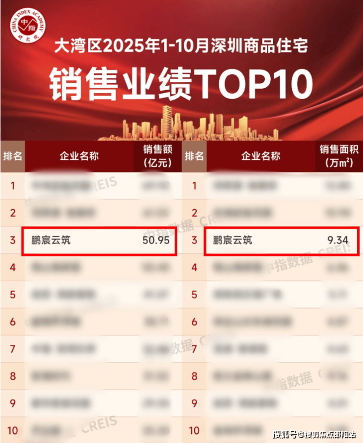 中指研究院数据统计,今年1-10月深圳商品住宅销售业绩榜单中,鹏宸云筑以50.95亿元的销售金额、9.34万㎡的销售面积,分别位列全市第三。