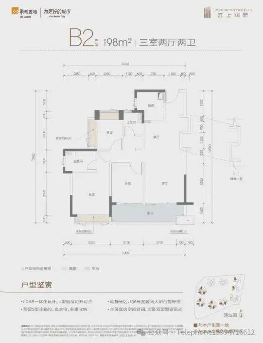 B2户型:经典竖厅格局,客厅3.45米开间,连接6.2米长的大阳台,得房率83.76%,西南、东南或西北向。