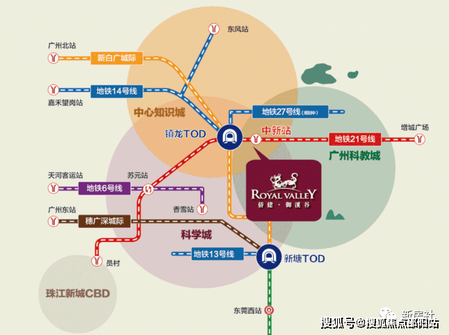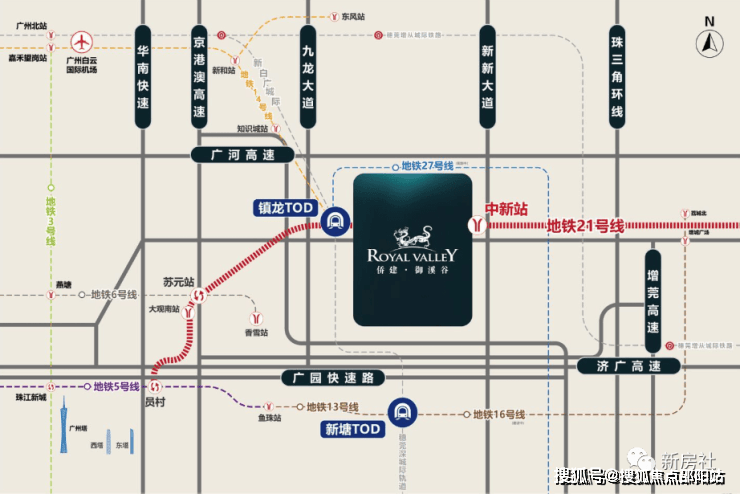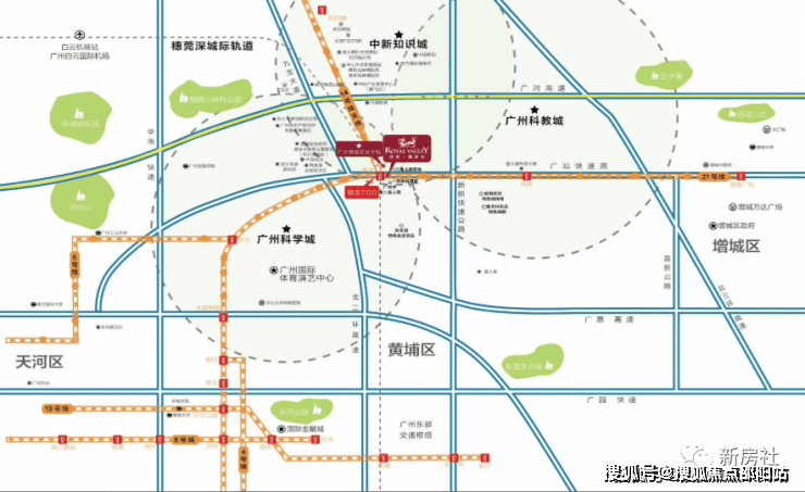 拥有四纵六横的交通网络,堪称广州东核心交通枢纽,是广州罕有的7地铁口上盖别墅物业。地处地铁21号线中新站之上,4站即达天河,1站可到镇龙TOD枢纽