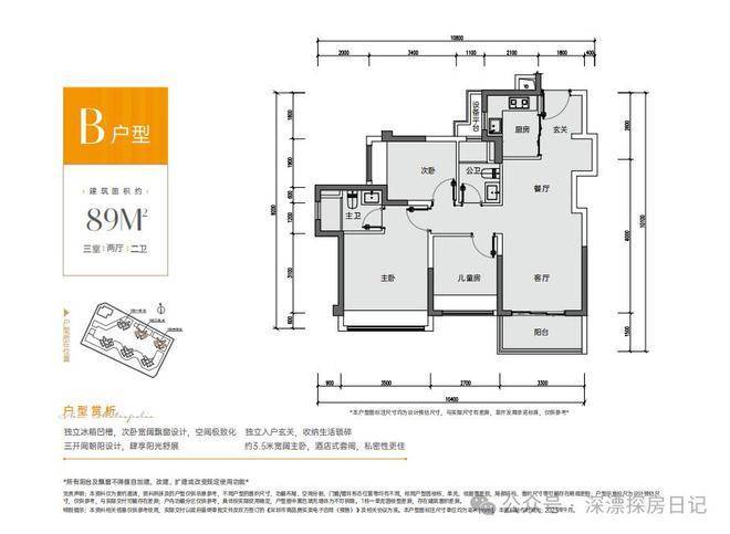 89㎡的3房2厅2卫,设计的是竖厅格局,客厅3.3米开间,S墙体设计预留双开门冰箱位,动静分区,三开间朝南,L型厨房,3个卧室的宽度分别为3.5/2.7/2.5米,得房率87.96-89.68%(包含赠送),阳台进深1.5米,朝西南或东南向。